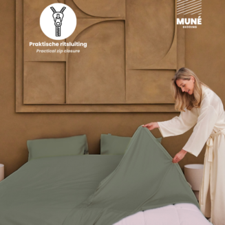 Met dit luxe Muné-overtrek doe je jezelf rust cadeau. Dankzij een weggewerkte rits aan 3 zijden en 2 handige gleuven wordt je bed verschonen een klusje van maar een paar minuten. Easy peasy! Dromen onder kwalitatief katoensatijn.