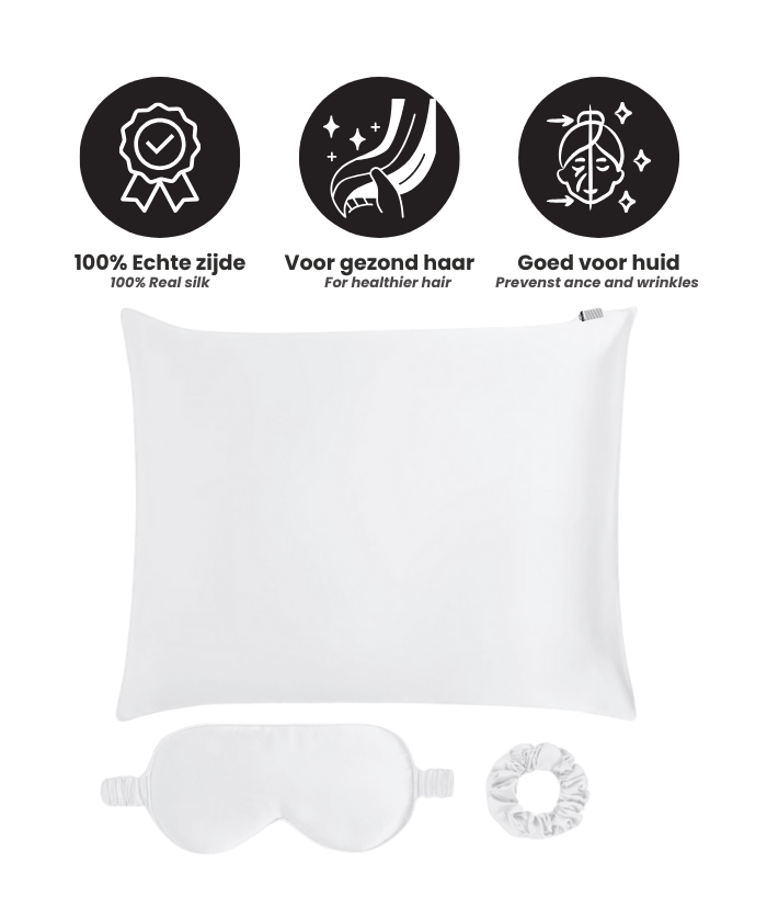 Zacht, koel en rimpelloos. Deze zijden set slaapaccessoires strijkt iedere nacht glad. Een luxe cadeau aan jezelf dat thuishoort in iedere slaapkamer. Het bestaat uit een kussensloop, oogmasker en scrunchie van premium 23 momme moerbei zijde. Een vrij rijk type zijde dat je nachtrust op verschillende manieren een upgrade geeft. Ontdek de voordelen voor je huid, haar en slaap.