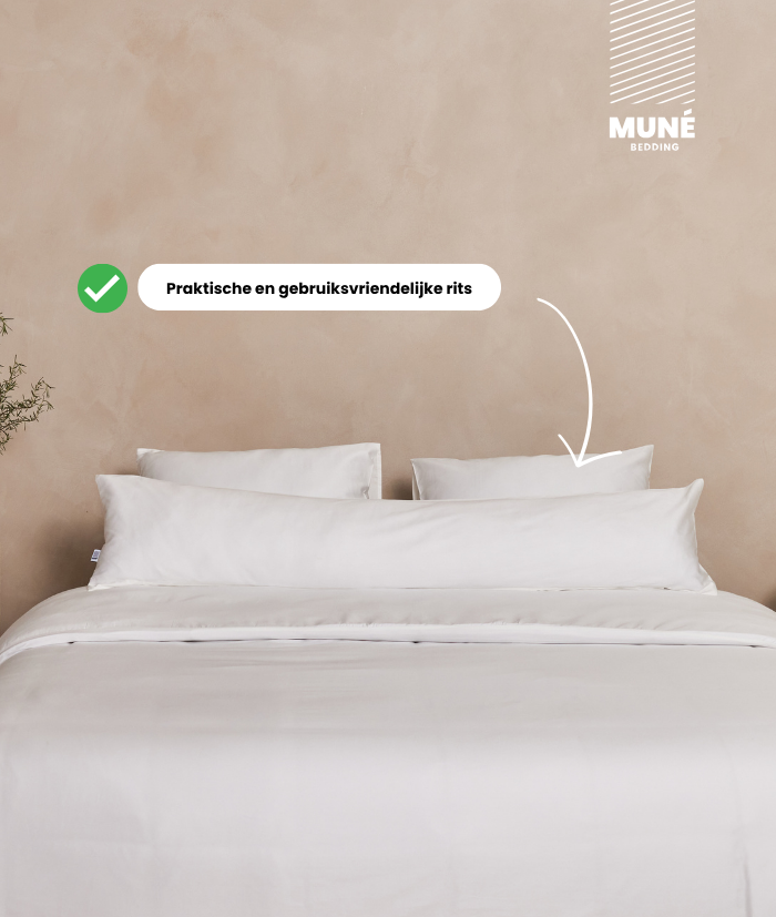 Dit slaapmaatje van Muné Bedding heeft niet alleen een fijne vorm. Ook de katoensatijnen stof van de los leverbare hoes draagt bij aan je ontspannen nacht. Zo voelt katoensatijn zijdezacht aan en werkt de stof temperatuurregulerend. Je innige omhelzing met je slaaprol voelt zo nooit te warm aan, maar ook niet te koud.